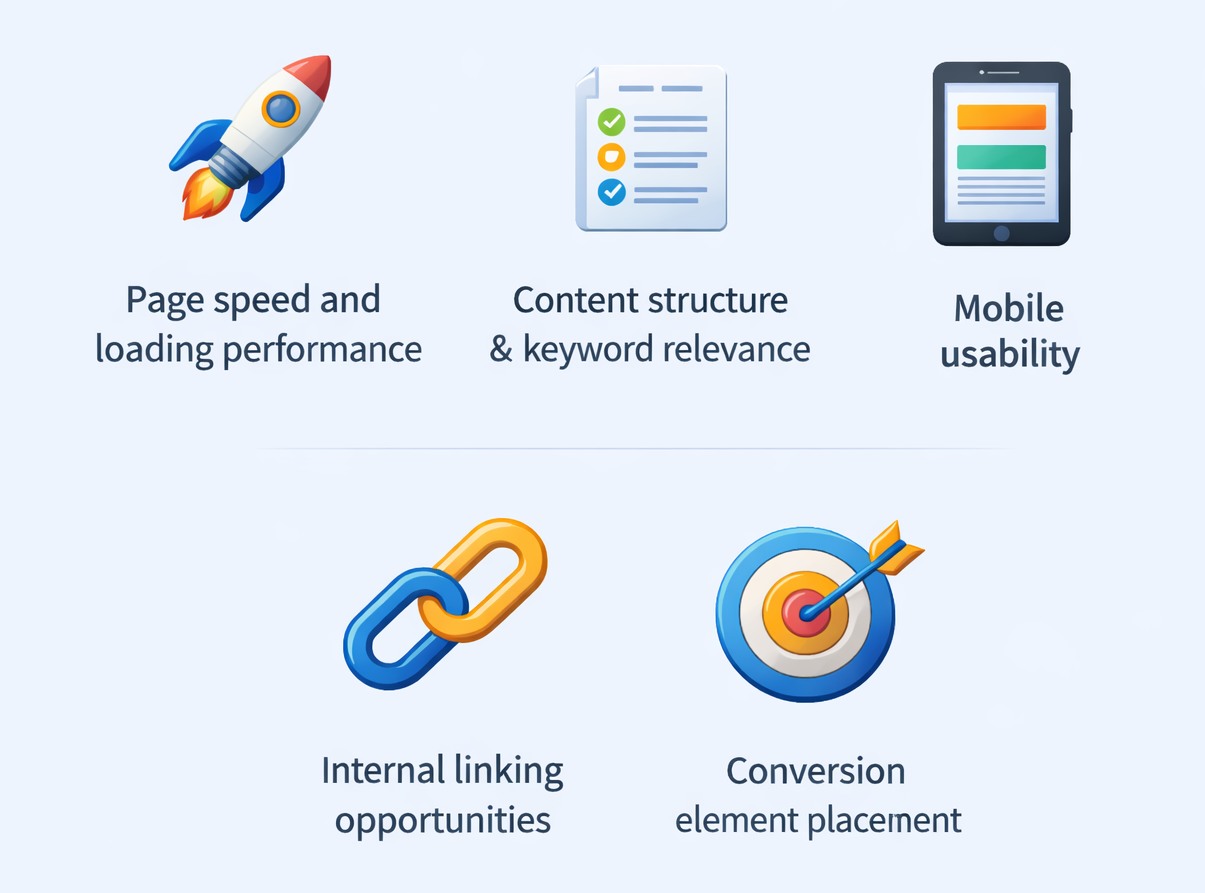 An SEO audit reviews page speed, content quality, keyword targeting, mobile usability, and technical health.