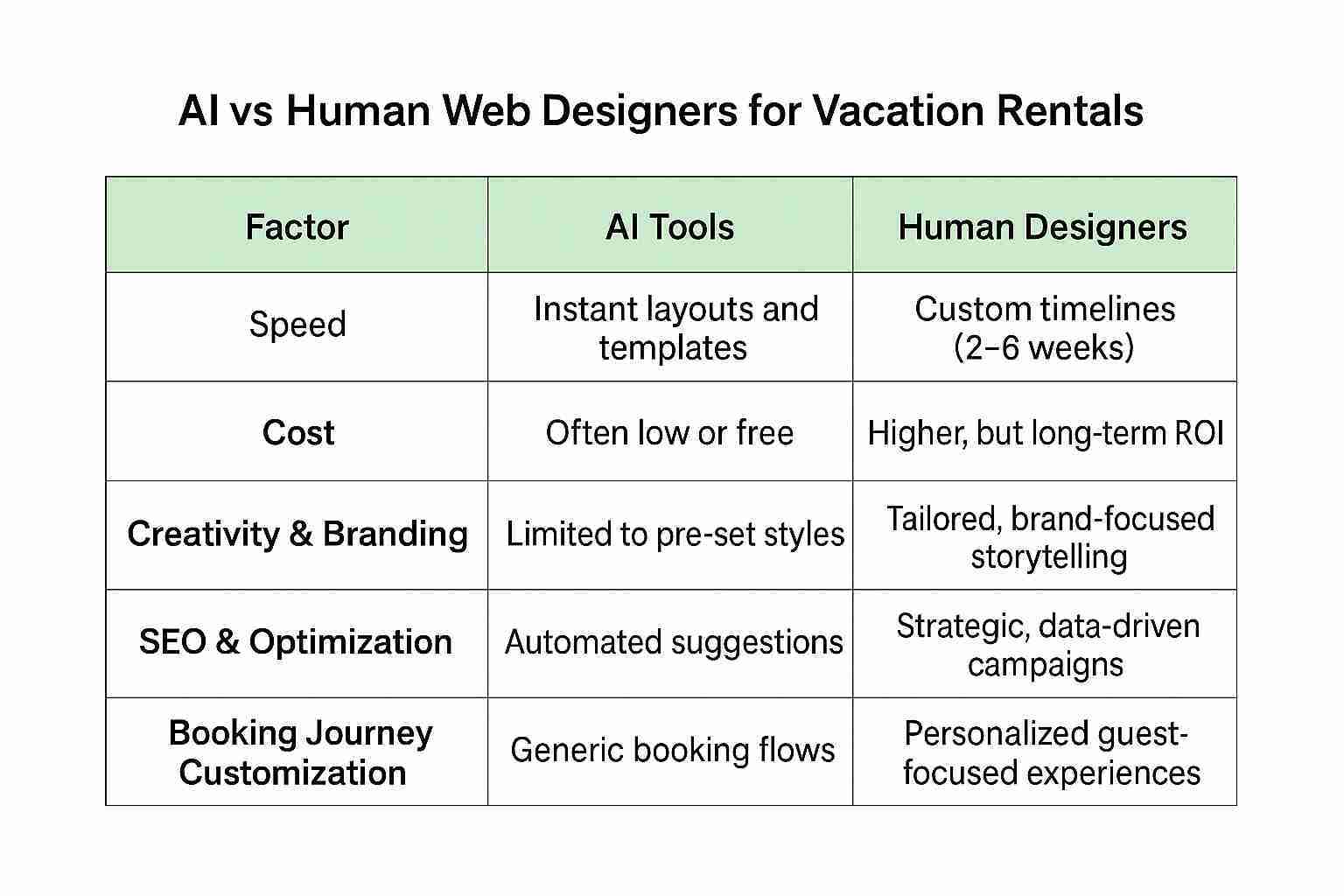 Vacation rental websites are not simply a digital coupon; they are a booking engine. When you operate a destination-based business, such as vacation rentals, your professional designer needs to cover the actual conversion of visitors into guests. AI has the potential to greatly simplify the design aspect here.